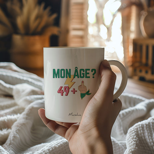 Mug anniversaire 50 ans - Femme - Mon âge ? 49 +