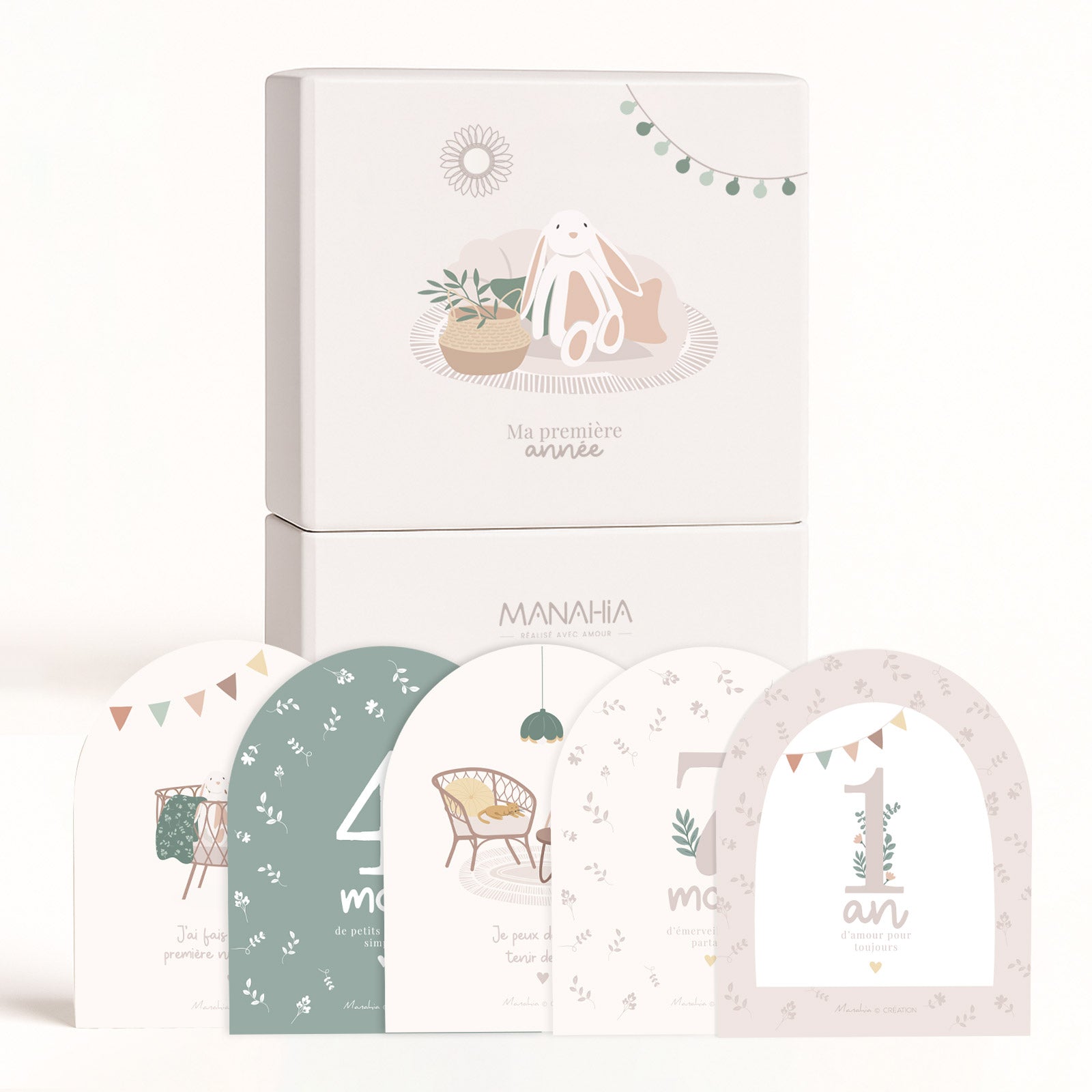 - 12 cartes “mois par mois” pour suivre l’évolution de bébé, de 1 à 12 mois