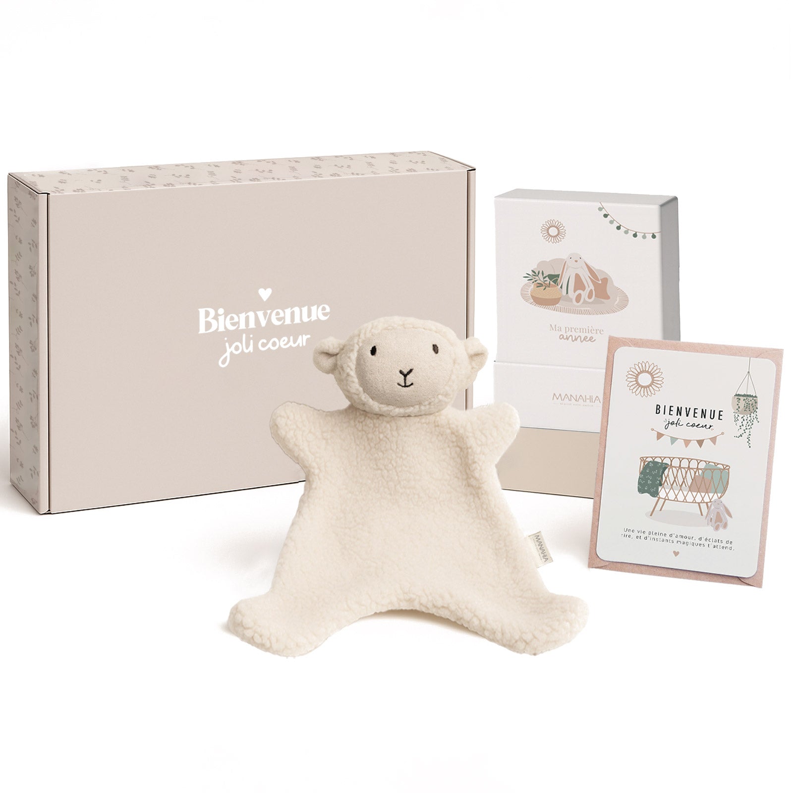 Coffret naissance bébé – Petit doudou mouton tout doux + 20 cartes étapes + 1 carte "Bienvenue joli coeur"